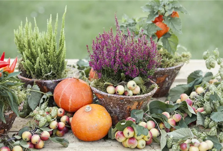 Schon eine einzelne, einfache Blüte fällt mehr auf, wenn sie von kräftig grünen Blättern, Gräsern, Farnen oder Kräutern umgeben ist. Deine herbstlichen Dekorationen mit Chrysanthemen oder Astern kannst du durch Zweige mit bunten Früchten der Jahreszeit individuelles Flair verleihen. Außerdem bekommen die Sträuße mehr Fülle und lassen sich besser binden – eine wertvolle Hilfe vor allem bei unbelaubten oder starren Blütenstängeln, z.B. Gerbera oder Rosen. Auch Ungeübten gelingt so ein üppiges Blumengebinde. Gleichzeitig unterstreichen die Zutaten die Wirkung der Blüten oder fügen sich, farblich aufeinander abgestimmt, harmonisch in die Dekoration ein. Kräuter verströmen zusätzlich einen zarten Duft nach Sommer frische. Gräser mit überhängenden Rispen sorgen für Dynamik und Schwung.