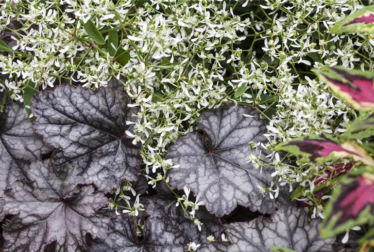 Wer es im Garten ein bisschen mysteriöser mag, der kann sein Beet mit Pflanzen in Weiß und Schwarz gestalten. So lassen sich weiße Blüten mit dunklem Laub kombinieren und erzeugen eine ganz besondere Stimmung im Garten. Perfekte Kandidaten dafür sind Heuchera. Sie haben ein ganz besonders gefärbtes Laub und sorgen für einen dunklen Untergrund. Passend dazu thronen über dem dunklen Laub der Heuchera dann weiße Tulpen oder Lilien. Petunien gibt es ebenfalls mit äußerst dunklen Blüten. Passend dazu können entweder Petunien mit hellen Blüten oder zum Beispiel mit weißen Verbenen kombiniert werden. Das Zusammenspiel von Weiß und Schwarz ist immer ein Hingucker und durch kaum eine andere Farbkombination zu toppen. Aber es müssen nicht immer Blüten im Beet sein. Die Kombination von verschiedenen Blattschmuckpflanzen ist auch immer ein Hingucker. Wie wäre es also mit zweifarbigem Efeu und Farn? Die beiden verstehen sich bestens und sehen zusammen einfach unschlagbar aus. Ein richtiges Dreamteam bringt im Beet eben so schnell nichts auseinander!