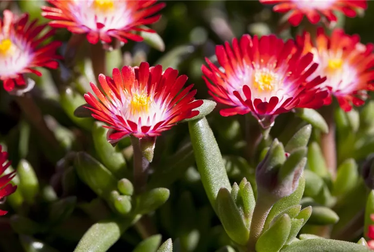 Die dickfleischigen, immergrünen Blätter der Delosperma sind saftig grün. Vertreter wie die Mittagsblumen zeichnen sich zudem durch einen niedrigen Wuchs und ihre teppichartige Ausbreitung aus. Bei einer maximalen Höhe von unter zehn Zentimetern, sind sie ideal als Bodendecker geeignet. Neben ihren Wuchseigenschaften sind jedoch auch die wunderschönen, auffälligen Blüten der kleinen Exoten nennenswert. Egal, ob die gelben, röhrenförmigen Blüten der Mittagsblumen oder die körbchenartigen, unterschiedlich farbigen Blüten der Winterharten Eisblumen dem eigenen Geschmack mehr entsprechen – jede dieser Pflanzen bietet unzählige Gestaltungsmöglichkeiten für den eigenen Steingarten. Dabei zeigen sich die sukkulenten, also dickfleischigen, Pflanzen äußerst anspruchslos: Ein sonniger Standort und ein trockener, durchnässter Boden genügt, damit die aus Afrika stammenden Pflanzen prächtig gedeihen. Unter diesen Standortbedingungen erfordern die Stauden kaum Pflege und müssen lediglich vor Stau- und Winternässe geschützt werden. Im Zweifelsfall kann eine einfache Drainage (also eine Entwässerungsanlage) sicherstellen, dass die wunderschönen Exoten keine nassen Füße bekommen.