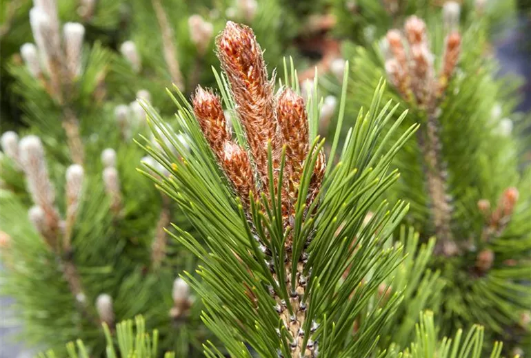 Nadelgehölze im Kleinformat haben den Vorteil, das ganze Jahr über ein grünes Kleid zu tragen. Im Winter hat man daran besonders viel Freude. Wenn die Adventszeit kommt, wird so manche Mini-Kiefer und Mini-Fichte mit Kerzen und Weihnachtsschmuck behangen. Das bringt eine Menge Behaglichkeit in die kalte Jahreszeit. Genauso hervorragend gegen den Frost gewappnet und ähnlich anspruchslos in der Pflege wie diese beiden sind auch Wacholder und Scheinzypresse in Zwergform. Es gibt Exemplare in edlem silbrig-blauen Nadelkleid. Ebenfalls sehr gefällig im frischgrünen Outfit und noch dazu schön dicht sind die Zwergformen des Lebensbaums. Auch Zwerg-Korea-Tannen sind gute Kandidaten für das Leben im Terrassengefäß.